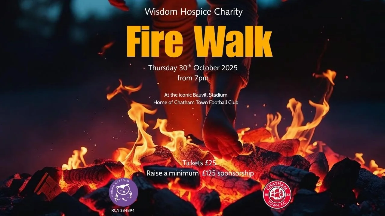 On Thursday 30th October, the Wisdom Hospice Charity, proudly supported by The Bauvill Stadium (home of Chatham Football Club), invites YOU to take part in an unforgettable Fire Walk Challenge.